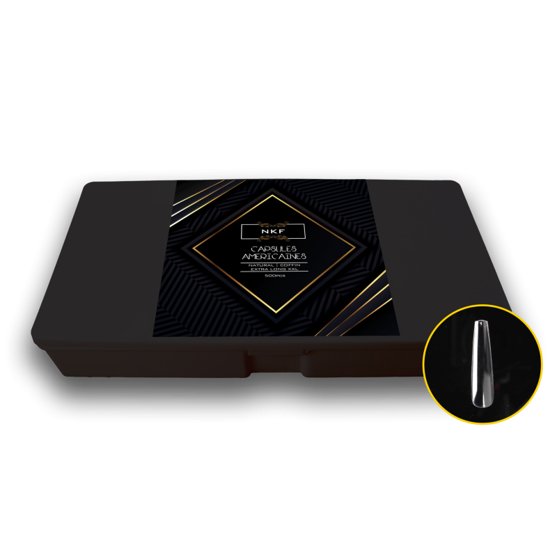 La boîte contient 500 tips « pose américaine », des capsules complètes à coller avec l’EXCELLENCE GEL NKF, qui est soak off (se dissout dans l’acétone).
